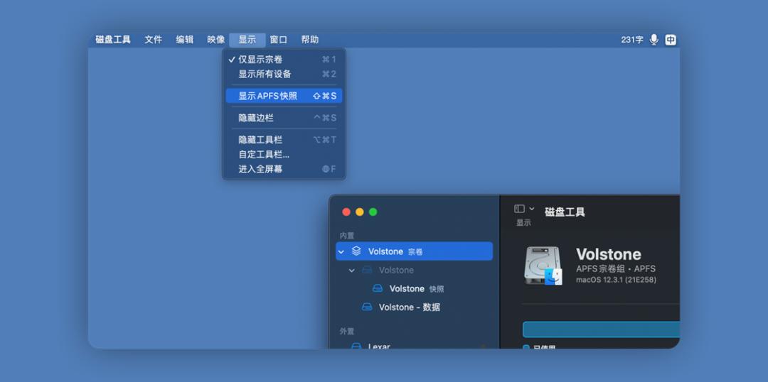 步骤:启动台 > 磁盘工具 > 显示 >「显示 APFS 快照」,然后选择相应的「宗卷」这样就会看到来自时间机器和全盘备份克隆创建的 APFS 快照。