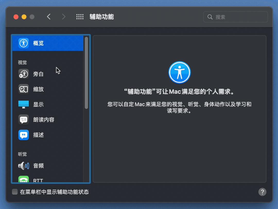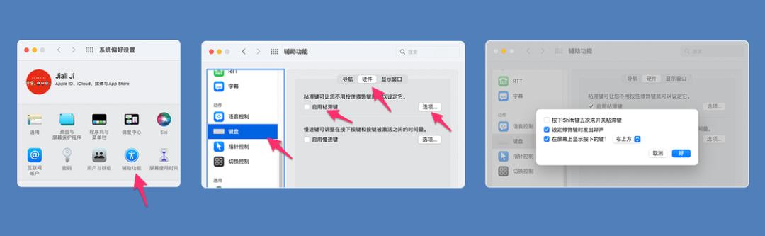 步骤:依次通过系统偏好设置 > 辅助功能 > 键盘硬件 > 选项开启。注意勾选「启用粘滞键」,然后检查右侧「选项」中的「在屏幕上显示按下的键」。