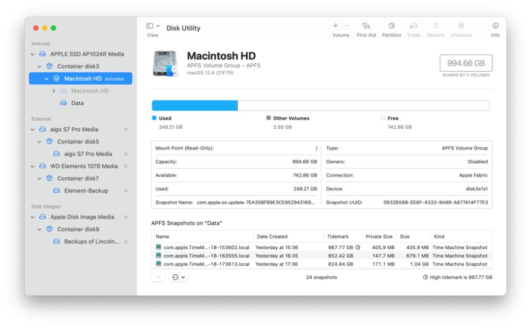 此前,查看 APFS 快照的方式对于小白来讲很不友好,需要要去终端中,通过输入命令的方式才能看到。现在 macOS 提供了更为简单的方法,而且也可以显示出更多的参数信息。