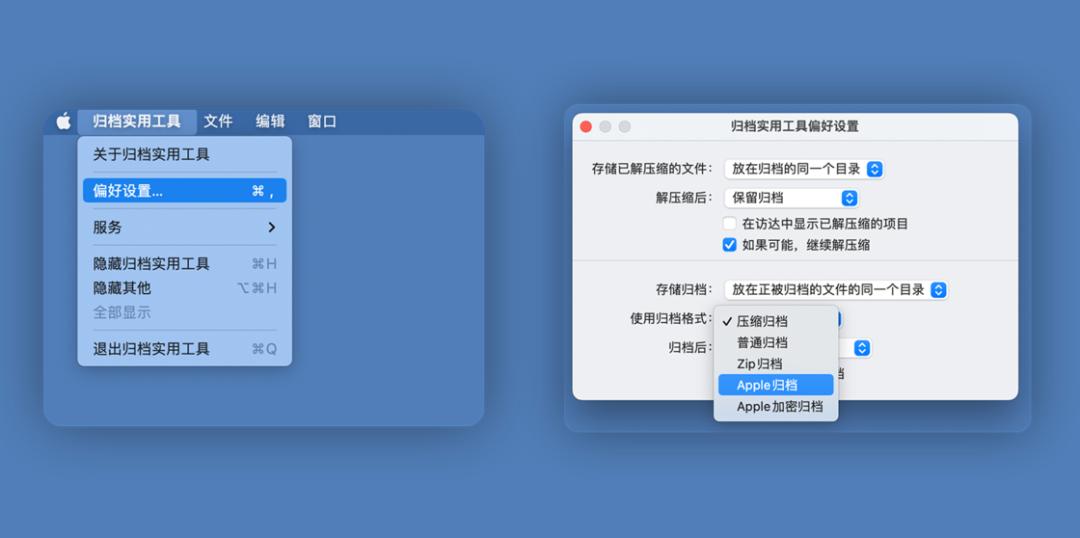 不过遇到注意的是,即使设置为 Apple 归档格式,此时的右键压缩功能仍为 zip 格式。我猜想因为兼容性的问题,Apple 归档格式尽量在对方也是 Mac 用户或者自己创建归档文件时使用。