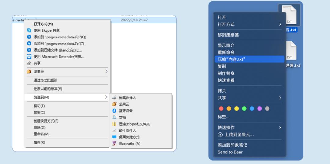 在 Windows 系统当中,在文件上按右键时,会出现一个发送到「压缩(zipped)文件夹」的选项。macOS 下的压缩功能本身与 Windows 系统自带的功能相似,用法也是类似,在文件上右键出现压缩功能。不管是 Windows 还是 macOS,系统默认的压缩最终的结果都是一个 zip 包。