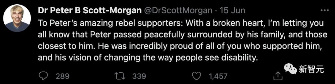 推特中写道,「彼得一直以来都有很多坚定的支持者和粉丝。但是我不得不怀着悲痛的心情告诉所有朋友们,彼得刚刚去世了。他走的很安详,病床边上围满了他的家人和他最亲近的人。我想说,彼得很感谢你们所有人一直以来的支持,他也很自豪,能够为残疾人出一份力。」