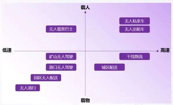 之所以有“降维”的概念,是因为自动驾驶维度足够多。通过载人、载物、低速、高速等不同场景分类,自动驾驶可以分为出租车、卡车、环卫、巴士、港口等多个等场景。
