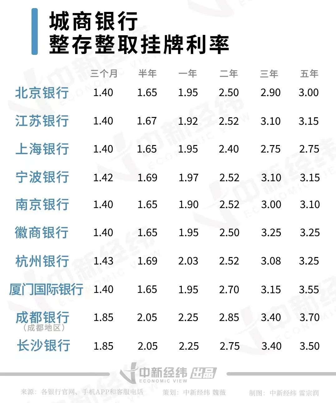 和国股行相比,城、农商行的挂牌利率更高。中新经纬选取了10家城商行查询,其中厦门国际银行、成都银行、长沙银行的三年期和五年期存款利率较高。以五年期整存整取产品为例,上述三家银行年利率分别为3.55%、3.7%和3.5%。