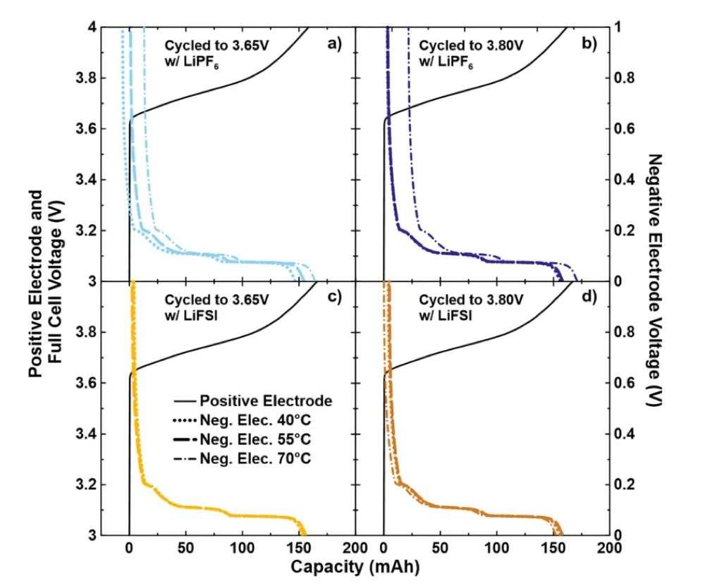 在电芯容量和正、负极电压关系的折线图中也能发现,当电池充电至3.65V时,双氟电池对温度不敏感,无论是40°C、55°C,还是70°C条件下,温度对正、负极电压的影响几乎为零。但是六氟电池正极电压随温度变化幅度非常明显。