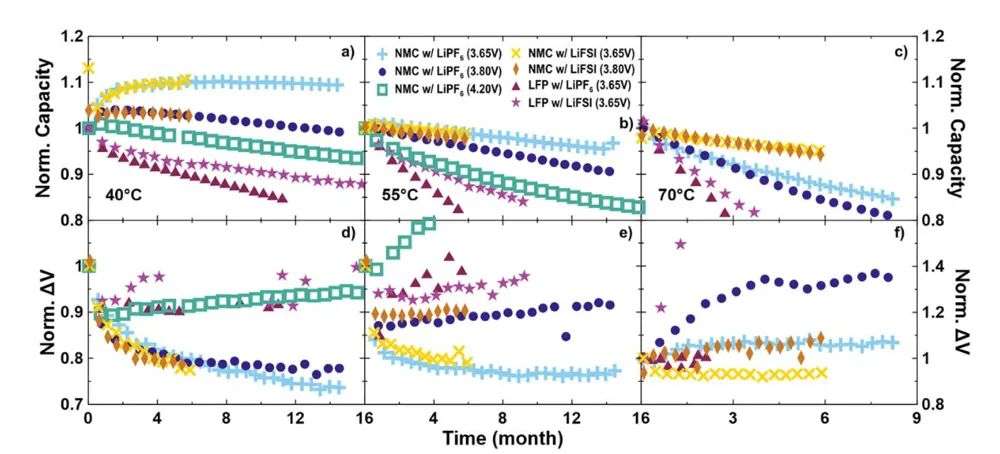 与此同时,更换了新电解液的NMC523电池寿命更长。无论是在气温适宜的20°C条件下,还是严酷的40°C、55°C条件下,LiFSI电解质盐的电芯有着更好的寿命表现。尤其在20°C条件下,电池在充电循环2000次之后,容量几乎不会发生衰减,明显强于普通NMC532和磷酸铁锂电芯。