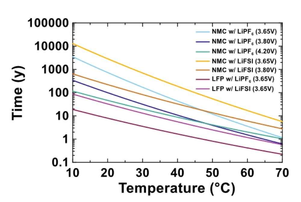 从上文的研究中可以总结,双氟电池具有更长的寿命。综合此前测试的数据可以绘制出一张温度与容量下降至80%所需时间的关系图,从图上可以发现,只要温度在20°C左右,双氟三元锂电池使用寿命能够超过100年。