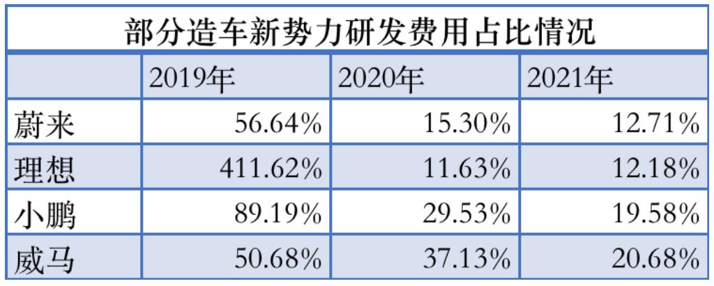 研发方面,威马汽车的招股说明书显示,截至2021年底,其研发人员有1141名,占员工总数的28.9%,并且,据威马汽车自称,其研发开支在营收中的占比,排名国内同行之首,达到了 20.7%——同期,“蔚小理”三家的研发投入在总营收中占比,分别为12.71%、19.60%、12.18%。