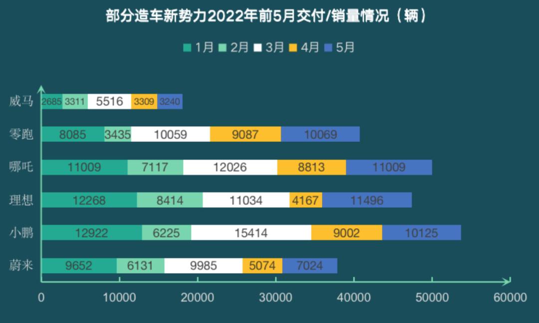 公开数据显示,威马汽车IPO前夕的2022年5月,小鹏汽车、理想汽车、哪吒汽车、零跑汽车4家造车新秀的交付量均已破万,分别为10125辆、11496辆、11009辆、10069辆,蔚来汽车虽未破万,但也达到了7024辆,是威马汽车3240辆的两倍多。