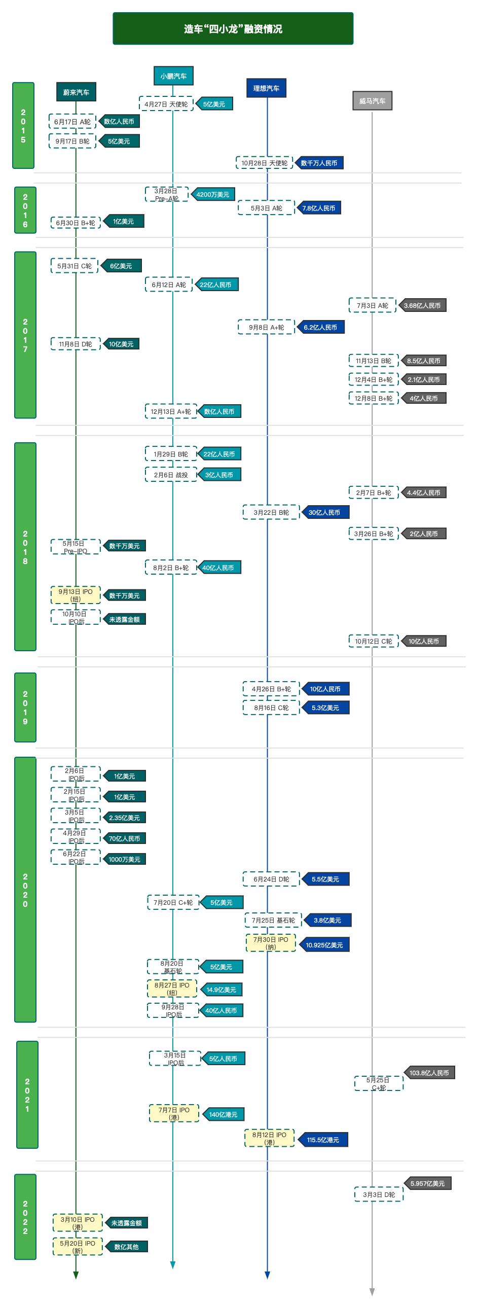 2020年9月22日,威马汽车完成了100亿元的D轮融资,这笔“造车新秀史上最大的单轮融资”落地时,“蔚小理”们都在筹备赴港二次上市了。