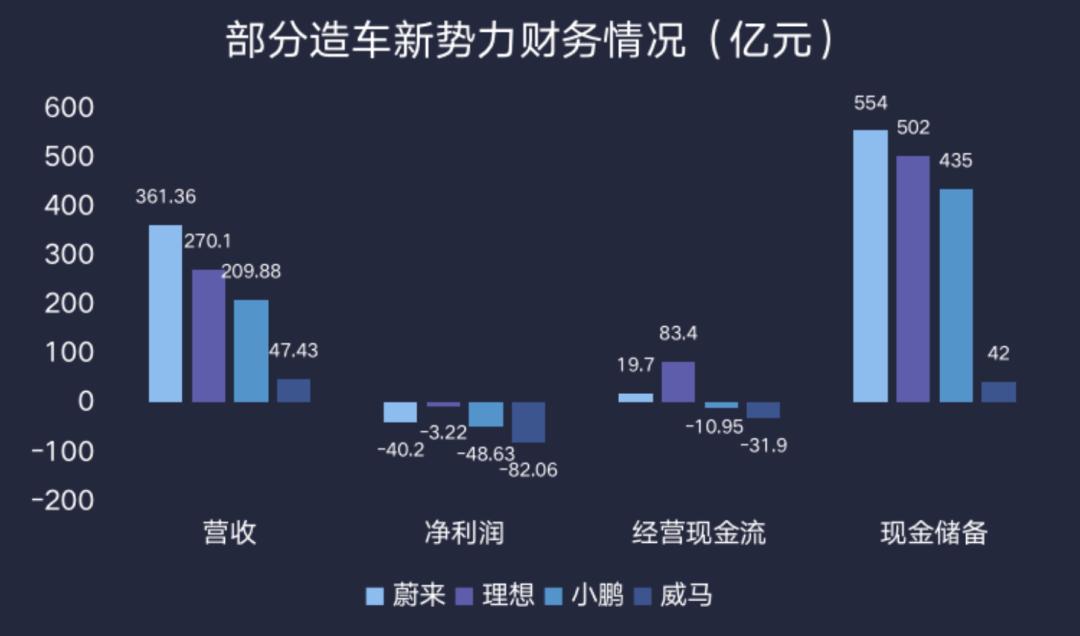 根据公开资料,在“四小龙”里,威马汽车相对而言销量更小、亏损更多。以2021年为例,“蔚小理”、威马汽车的营收规模分别为361.36亿元、209.88亿元、270.1亿元、47.43亿元,亏损规模分别为40.2亿元、48.63亿元、3.22亿元、82.06亿元。