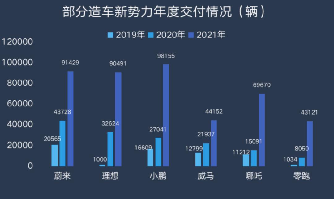 到了4年后的2021年,“蔚小理”三家的年交付量分别为91429辆、98155辆、90491辆,距离10万辆年销量仅一步之遥。威马汽车的交付量为44151辆,差距已肉眼可见。而且,原本属于后排阵营的零跑汽车、哪吒汽车也都开始追赶上来了。