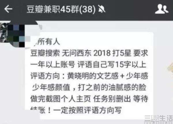 在涉嫌对贺岁档国产影片影评进行“低评分引导”的传言出现还没过两年,2018年《无问西东》刚进入院线又陷入刷分风波中。据悉,该片在公映的整个过程中豆瓣评分开分仅6.5、甚至还在短期内骤降至6.2分,并且随后在有业内人士表示“有团队出于竞争的目的而恶意刷差评诋毁”后,其评分一度飙升至7.4。彼时在豆瓣网友发文指责“人为刷高分”的行为,并且相关“豆瓣刷分”、“豆瓣影评推广”等第三方微信群及QQ群也被曝光。