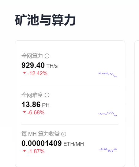 因为目前 ETH 全网算力已跌到了 929.40 TH/s,比 12 号的 1018 TH/s 跌去了 89 TH/s。