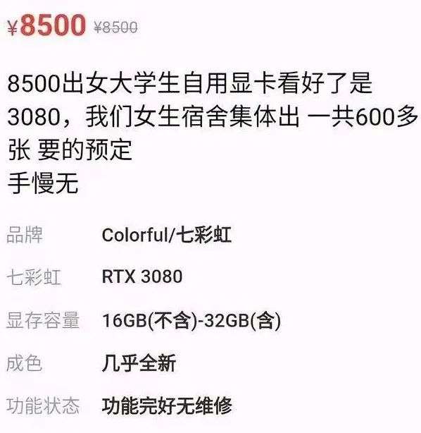 以 3080 为例,3080 去掉最后一位的 0 ,入手价格只能是:308 元!!!多一分都不带考虑的!!!