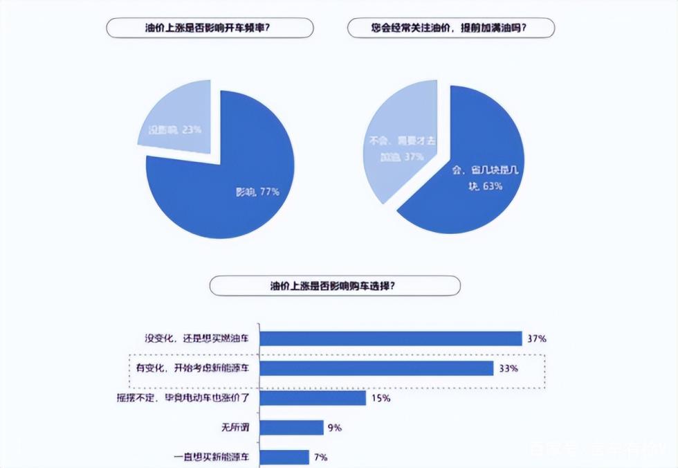 此前,某网站就曾做过一个关于油价上涨是否会影响买车的调查,有33%的消费者在问到“油价上涨是否影响开车频率”这个问题时,这里面有63%的消费者其实都有选择新能源的倾向,比例相比起以往来讲有很大提升。