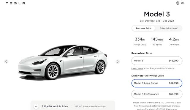具体来看,美国官网显示Model 3长续航版涨价2500美元至5.799万美元;Model 3高性能版涨价1000美元至6.299万美元。
