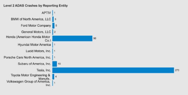 自去年 7 月以来,特斯拉共发生了 273 起涉及辅助驾驶系统的事故,名列第一。从 2016 年至今,美国 NHTSA(国家公路交通安全管理局)已经针对至少 33 起涉及特斯拉 Autopilot 系统的撞车事故进行了调查,在这些事故中,共有 11 人遇难。