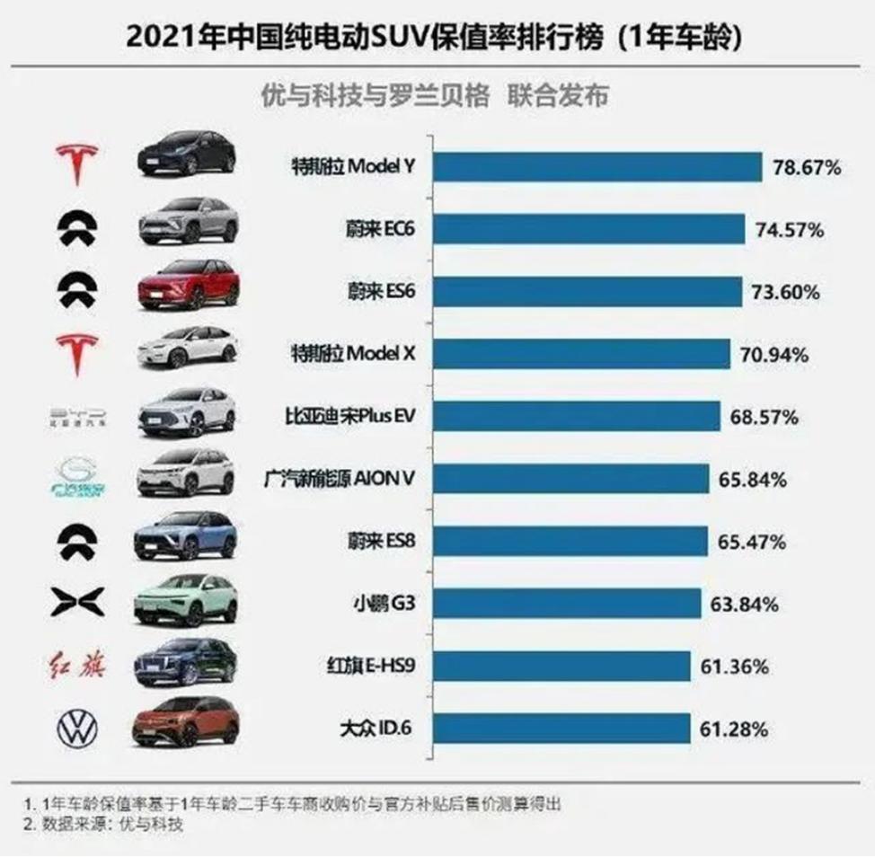 还有关于“保值”的问题,在经过调价后的特斯拉、小鹏等新能源汽车,在二手车市场依旧很抢手,根据《2021年电动车保值率排行榜与市场洞察》显示,特斯拉遥遥领先。
