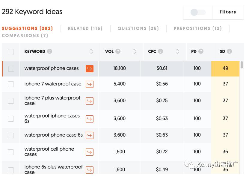 网站会提供给你大量可供选择的关键词,但在做选择的时候,最好优先关注搜索量高的那部分(比如高于1000),高搜索量意味着较低的SD(SEO difficulty,搜索引擎优化难度),和更高的曝光率。