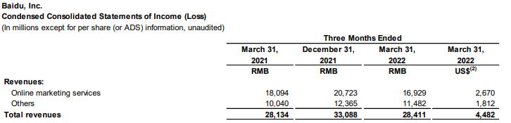 以百度举例,2022 年百度的第一收入仍是广告收入,第一季度,百度实现营收 284.11 亿元,其中,广告收入为 169.29 亿元,占比 59.58%。