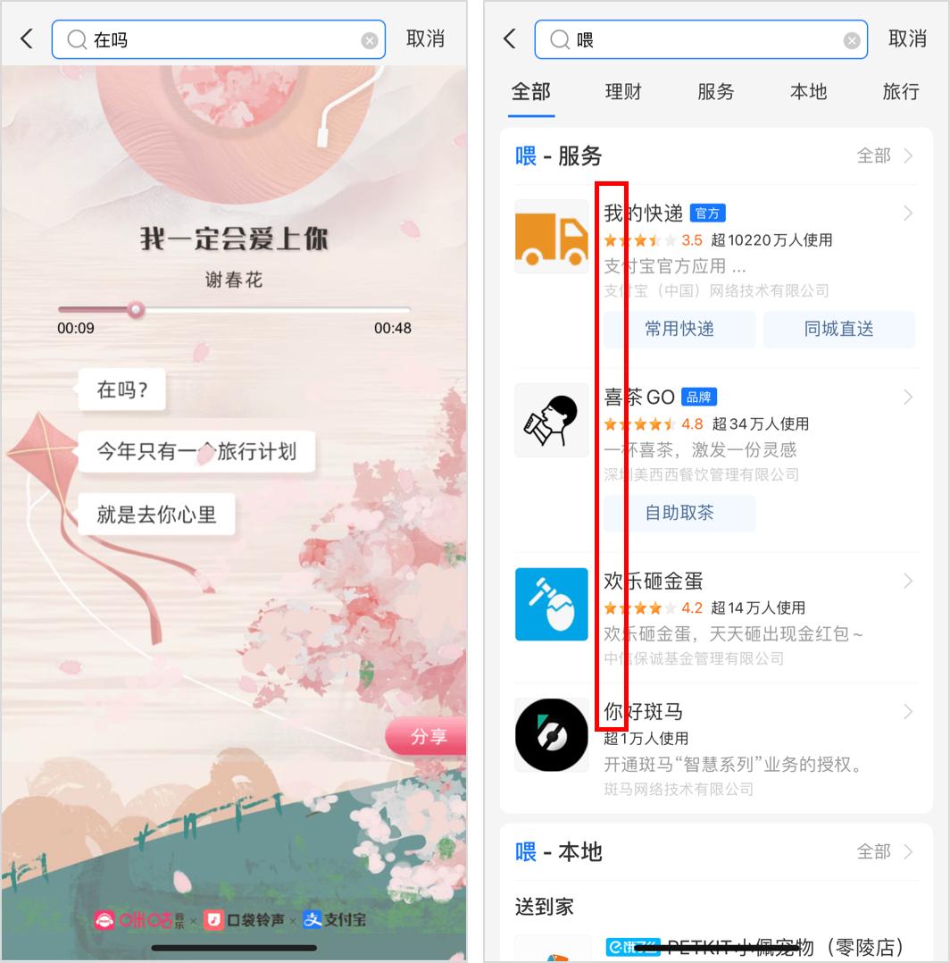 去年情人节,用户在支付宝搜「在吗」即可随机获得一首情歌;而前年的 520 ,支付宝则引导用户搜索「喂」,做了一波“我喜欢你”的藏头诗营销。