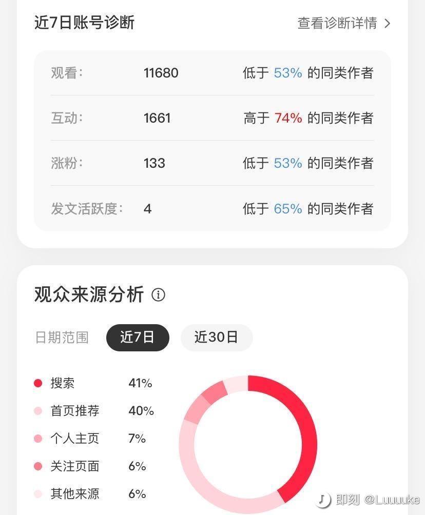以即刻网友@Luuuuke 的笔记为例,来自于首页推荐和搜索的流量都占到了 40% 的比例,远超个人主页等其他来源。