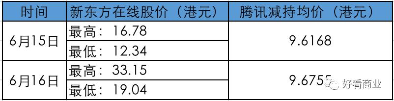 按照港交所的文件,腾讯6月15日和6月16抛售的均价分别为9.6168港元和9.6755港元;相比当日新东方在线的最低股价,分别有22%和49%的折让。