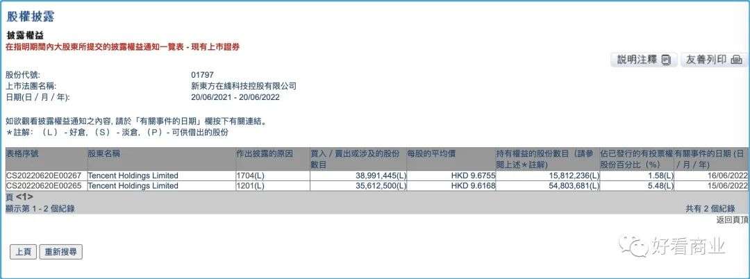 港交所的文件显示,腾讯在6月15日和6月16日分别大幅减持新东方股票,使得持股比例从9.04%降至1.58%,共套现约7.19亿港元。
