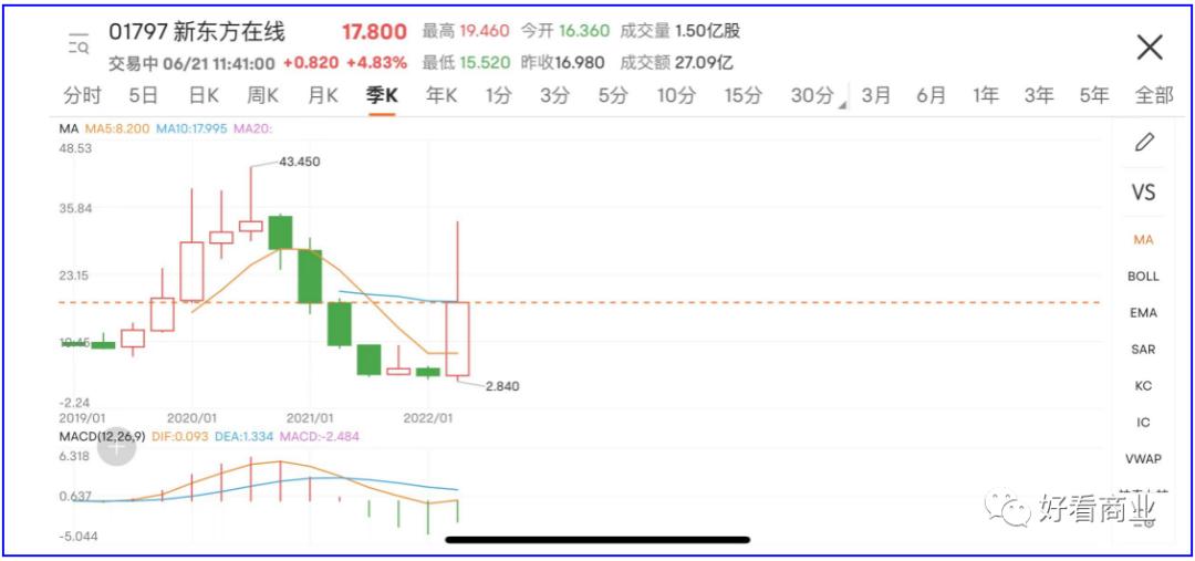新东方在线股价自2021年初急转直下,到2022年5月已跌至脚踝—2.84港元。