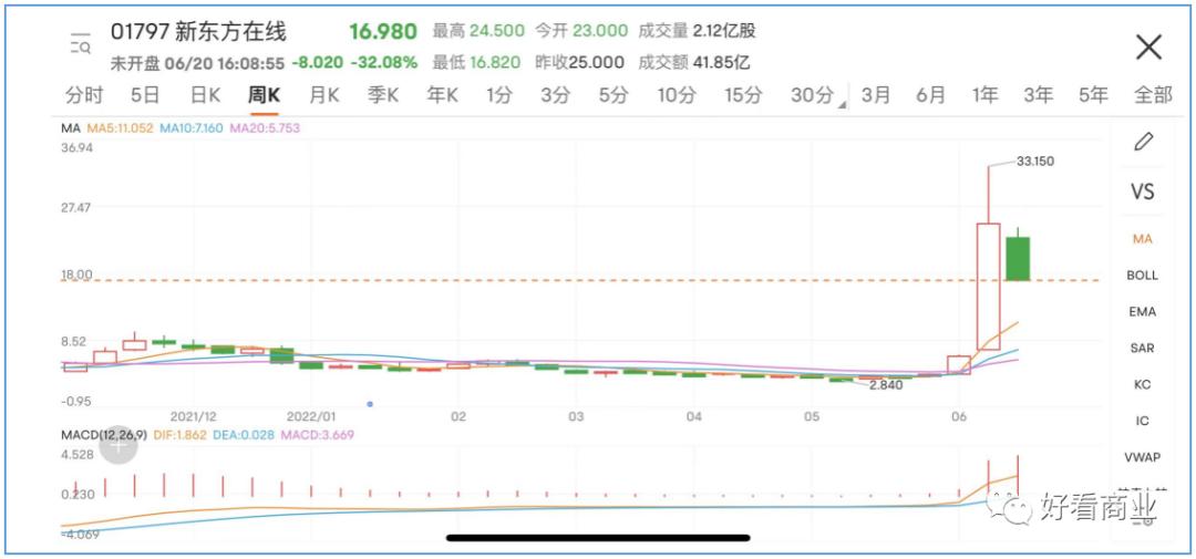 在2020年,新冠疫情爆发,带动在线教育概念股被资本市场追捧,新东方在线股价一路高走,并在2020年7月触及43.45港元高点。