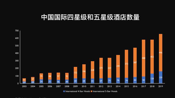 随着民企的进入,酒店发展到了第二阶段,代表的商业地产商业模式为,以万达城市综合体的开发模式。此时,国际品牌酒店纷纷进入中国,中国的酒店发展进入黄金时代:中国国际四星级和五星级酒店数量从2003年的41+27家增长到2019年的159+496家。