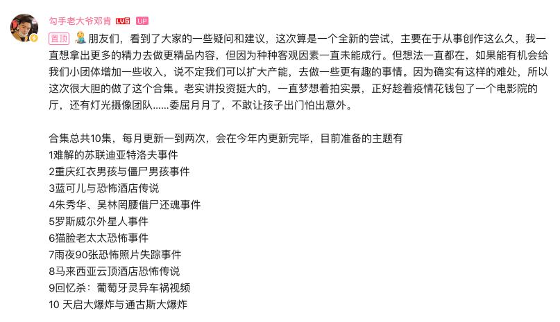 根据UP主“勾手老大爷邓肯”的说法,这一付费视频合集名为“邓肯解说世界十大未解之谜/灵异事件”,包含了10集。也就是说,网友们付30块钱,就能看完这10集视频。小雷在该UP主的视频页面中发现,目前该合集只更新了第一集。