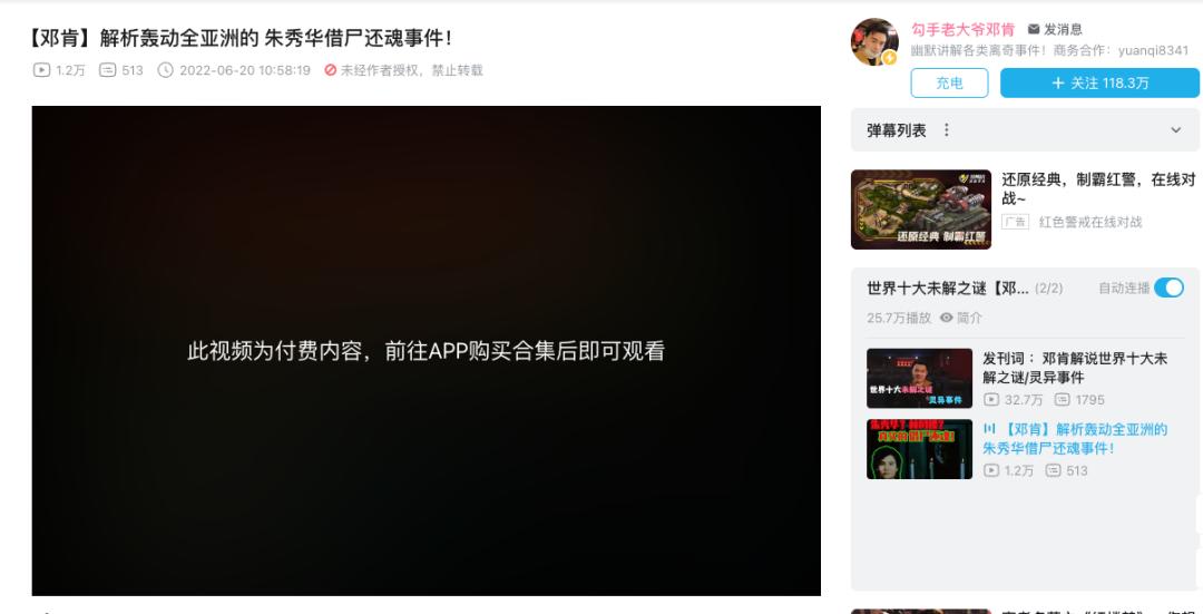 近日,据新京报报道,B站UP主“勾手老大爷邓肯”上传的系列视频,成为了该站首个付费视频系列。用户需要通过手机App打开该视频,完成付款后才可以收看。想要看该UP主的视频合集,你得先支付30元。“勾手老大爷邓肯”是一位专门解说灵异事件的UP主,幽默的讲解风格深得网友喜爱,目前B站粉丝多达118.3万。