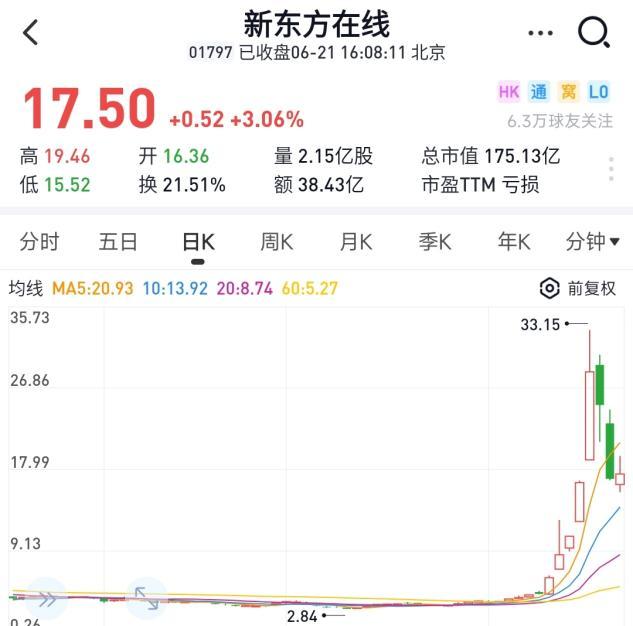 雪球App显示:港股新东方在线的股价,目前接近18元,市值约为180亿元;而就在上周的6月16日,其股价最高超过了33元,市值超过了300亿元。