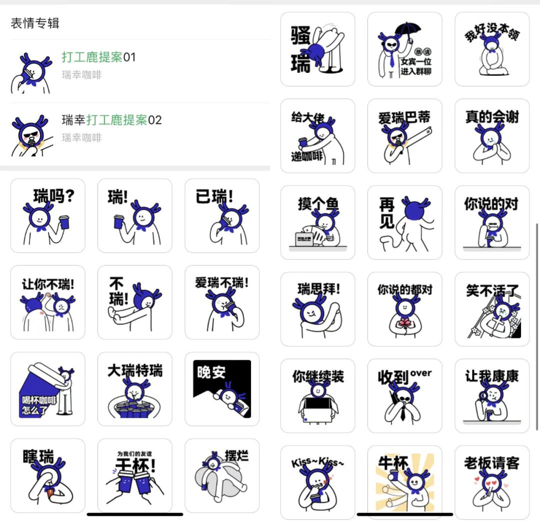 除了每日不停地“碎碎念”,瑞幸还推出了“打工鹿提案”系列表情包,表情包内容也符合目标用户的日常交际用语,比如“真的会谢”、“笑不活了”等。