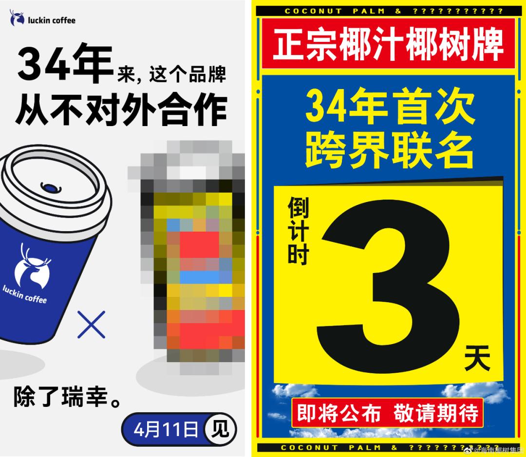 其次,前期预热吊足了胃口,就在联名发布前三天,两家企业一边互捧,一边营造神秘的氛围。瑞幸发布海报表示:“34年来,这个品牌从不对外合作,除了瑞幸”。椰树也是发布海报表示:“正宗椰汁椰树牌,34年首次跨界联名。”