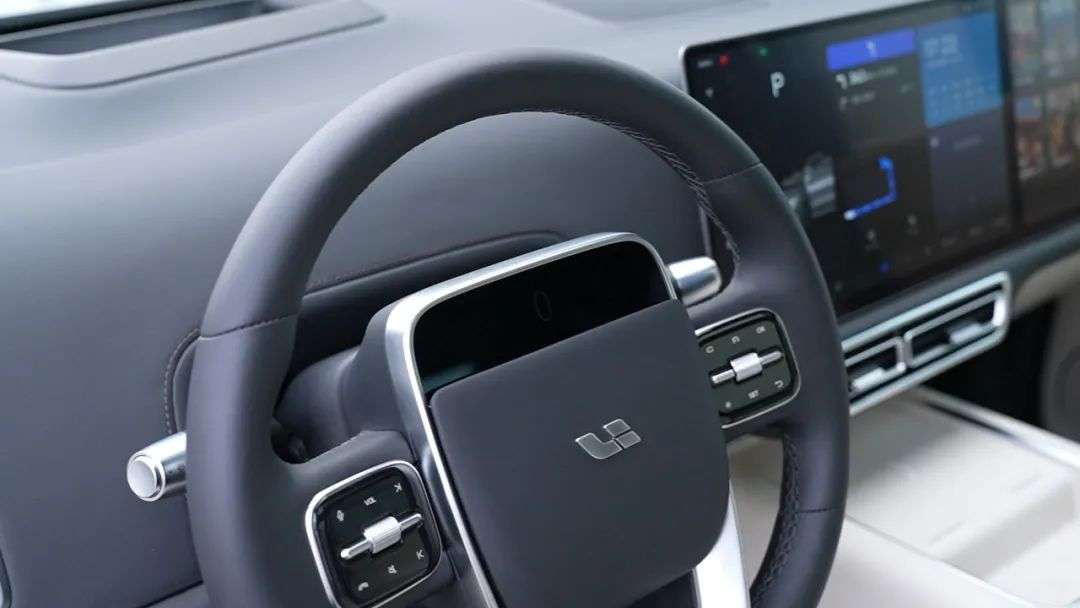 L9一共搭载了5块屏幕,大胆的取消了传统的仪表盘,取而代之的是在方向盘上,设置了一个小块的提示屏,把传统的仪表屏显示的信息转移到了HUD上。
