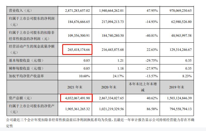 疫情期间,居家办公人员暴增,让主导人体工学智能办公理念的乐歌股份吃到一波红利。在2021年,乐歌股份实现营业收入28.71亿元,归母净利润1.8亿元,资产总额达到40多亿,公司账面现金流2.6亿元。