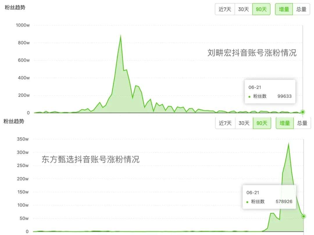 从下图的涨粉曲线可以直观看到:刘畊宏账号明显体量更大,但如今确实是“爆红”阶段已过,其粉丝净增速度已经趋缓,昨日单日净增9万+;东方甄选也呈现相似的曲线,虽然还在快速涨粉,昨日单日净增57万+,但粉丝增量在6月16日到达一个峰值后开始下降。
