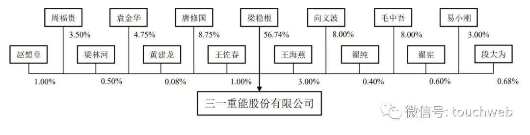 IPO后,梁稳根持股为42.56%,唐修国持股为6.56%,向文波、毛中吾分别持股为6%,袁金华持股为3.56%;