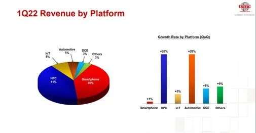 2022年第一季度,台积电HPC(高性能计算)业务增长强劲,是该公司营收的最重要一环,占比达到41%,而传统强项智能手机业务增速在第一季度放缓,营收占比为40%(上一季度为44%)首次被HPC超越,占比位列第二。此外,第一季度汽车电子业务营收占比虽然只有5%,但与HPC业务一样,增速十分强劲。