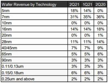 2021年第二季度财报显示,按制程划分,台积电该季度5nm芯片出货营收占比为18%,7nm为31%,16nm为14%,28nm为11%。其它各制程的收入占比如下图所示。