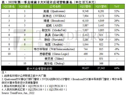 6月初,TrendForce发布了2022年第一季度全球前十大IC设计厂商营收榜单,总营收达到394.3亿美元,年增44%。