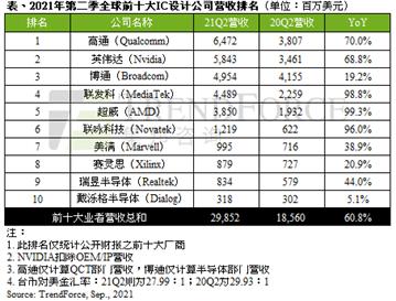作为对比,我们看一下TrendForce于去年发布的2021第二季度全球十大IC设计厂商的营收排名榜单,如下图所示。