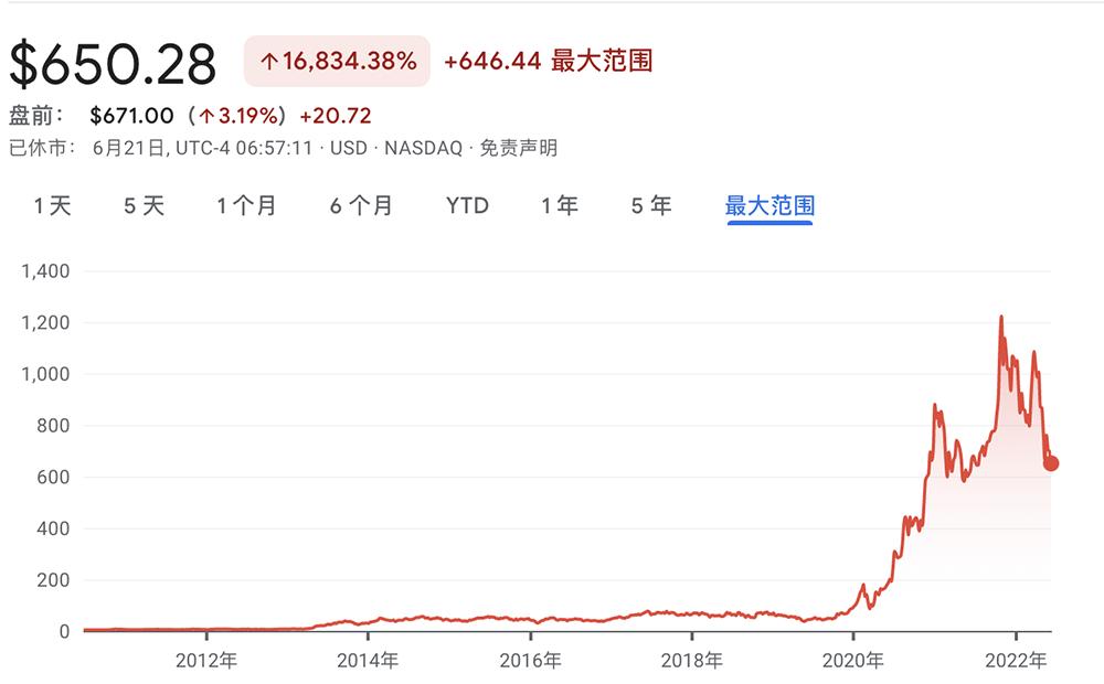 6月21日,特斯拉美股股价下跌至650.28美元/股(折合人民币约4354.7元/股),而特斯拉美股股价最高曾达到1222.09美元(折合人民币约8184.3元/股)。并且在过去的半年内,特斯拉美股股价一直在动态下降。