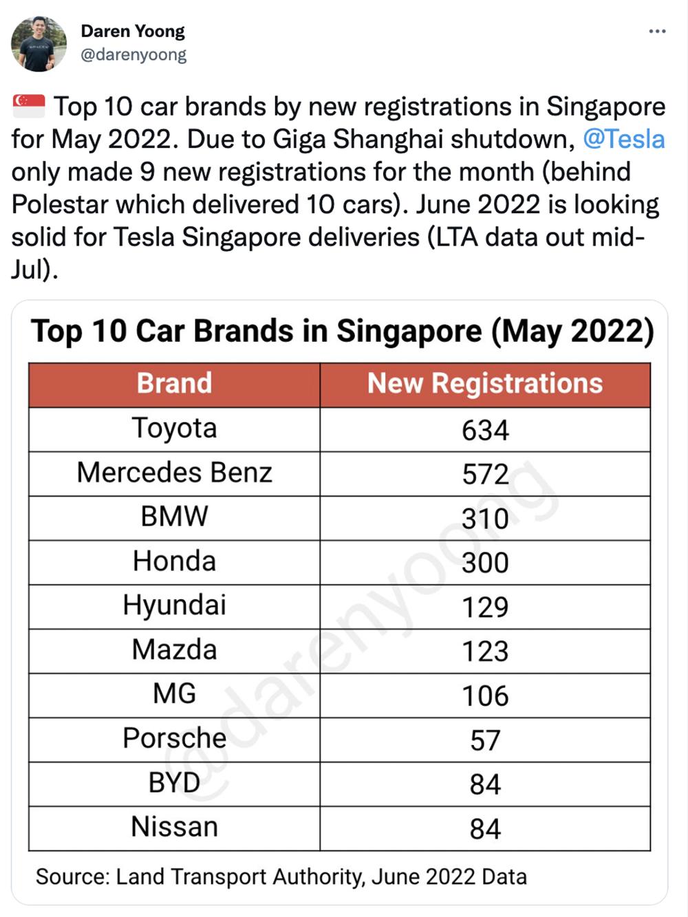 不过这些工作掩盖不了Christopher Bousigues任期的失败,据推特用户Daren Yoong透露,受上海疫情影响,5月份特斯拉在新加坡仅仅有9个车辆注册信息,其他月份也没有很多。其他用户透露,和特斯拉同价位的情况下,新加坡最受欢迎的还是宝马奥迪这类豪华品牌。