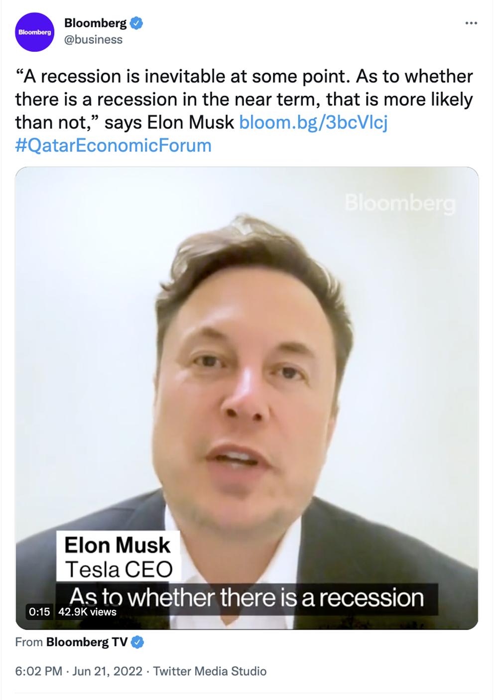 不过,马斯克也不得不在卡塔尔经济论坛上承认,“衰退在某些时候是不可避免的。至于短期内是否会出现衰退,这很有可能。”