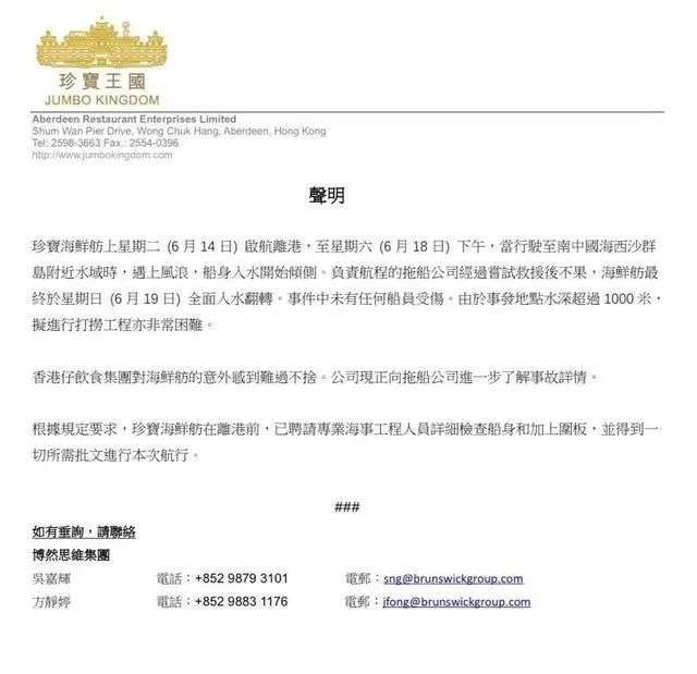 香港仔饮食公司6月20日公告称,旗下著名的海上餐厅珍宝海鲜舫18日在西沙群岛海域遭遇风浪入水,尝试救援未果,最终在19日全面进水翻转,沉至海底。