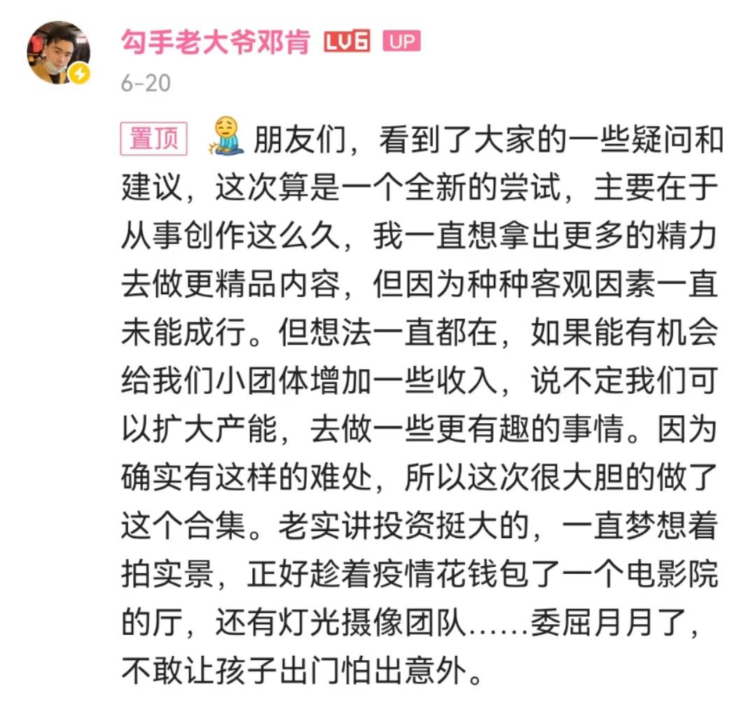 对此,该UP主回应称,希望经济独立、不差钱并真心喜欢UP主的人花钱购买这个系列,大家量力而行。他表示,这次是一个全新的尝试,包了电影院拍实景,还有灯光摄像团队,投资挺大。